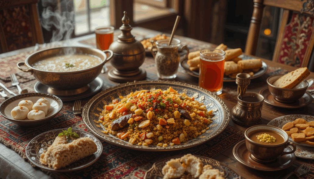 Yemeklerin yanında, ev yapımı klasik hoşaf hem ferahlatıcı hem de mideyi rahatlatıcı bir seçenek olarak sofrada yer alıyor. Doğal meyvelerle hazırlanan hoşaf, ağır yemeklerin arasındaki dengeyi kuruyor. Tatlı olarak sunulan klasik nişastalı aşure ise Osmanlı tatlı geleneğinin en eski ve özel temsilcilerinden biri. Hafif yoğun ve nişastalı yapısıyla, şerbetli tatlılardan farklı olarak, daha sade ama karakteristik bir tatlı deneyimi sunuyor.